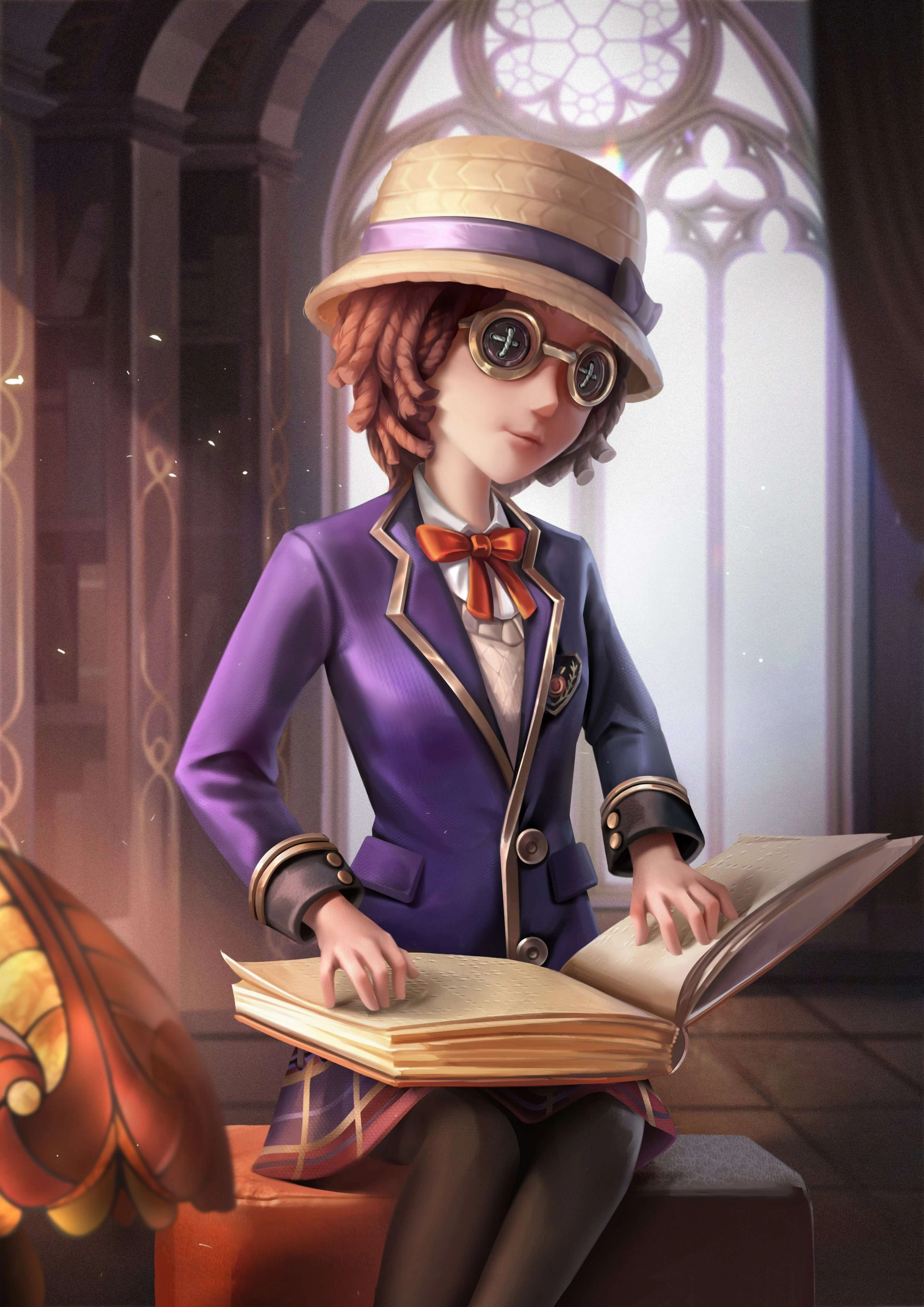 The inability to see with both eyes allowed The Mind's Eye to devote herself to her studies without distraction. With her diligence and talent, she entered the ivory tower and became their pride in the eyes of others. On campus, she still doesn't have much time to dress herself up. A white shirt, an apricot sweater, a blue coat, a purple plaid skirt, and black high heels. The standard campus uniform is enough to meet the needs of studying and socializing. However, the beauty-loving nature cannot be extinguished. The red bow on the neckline and the flat straw hat on the head are quite fashionable, adding a bit of youthful atmosphere to her.