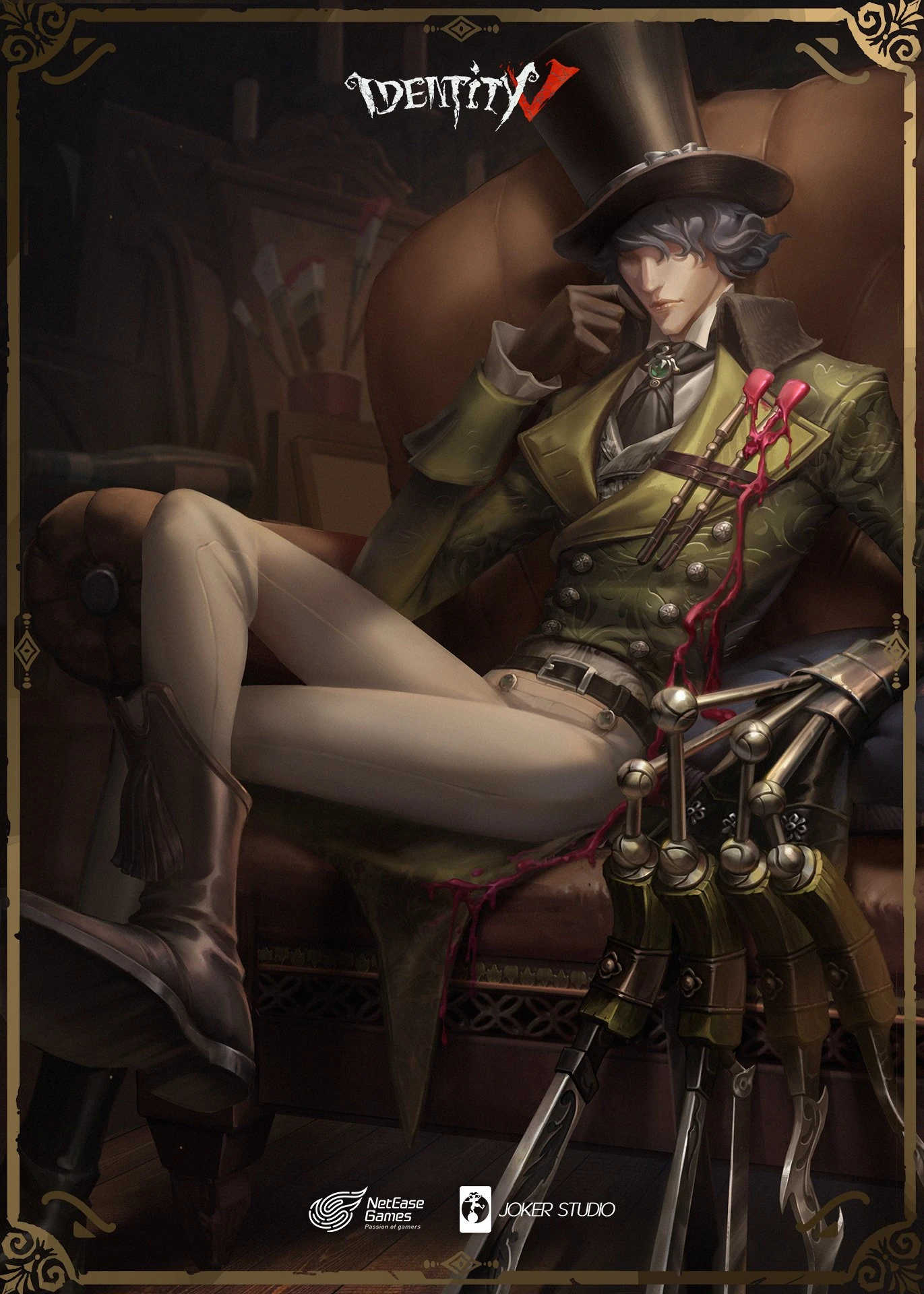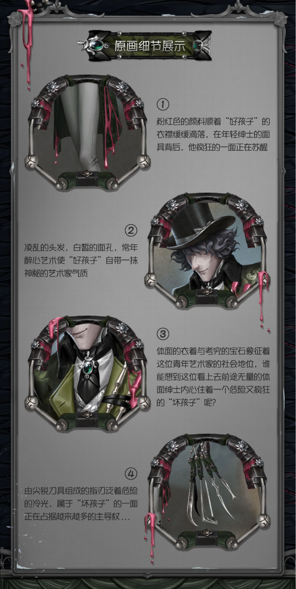 According to the settings of "The Ripper", "Good Child" is designed as the time that he is still struggling with his another chaotic personality. His decent uniform and a young and handsome face undoubtedly reflect his identity as an elegant young artist. And those knives tied to the fingers, the paint flowing on the body. . . They also embodied the hidden madness and danger of "The Ripper".