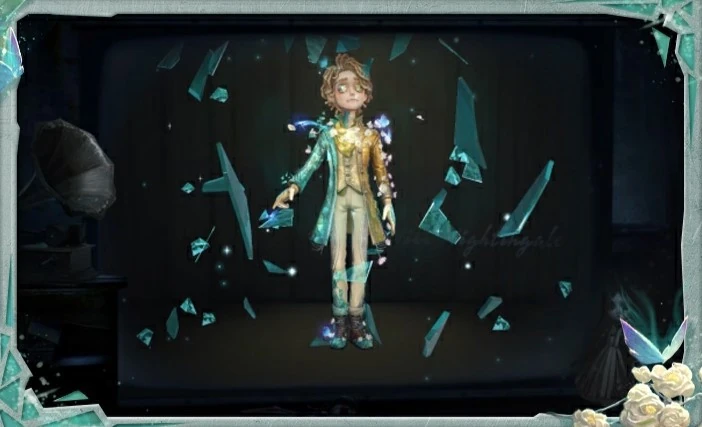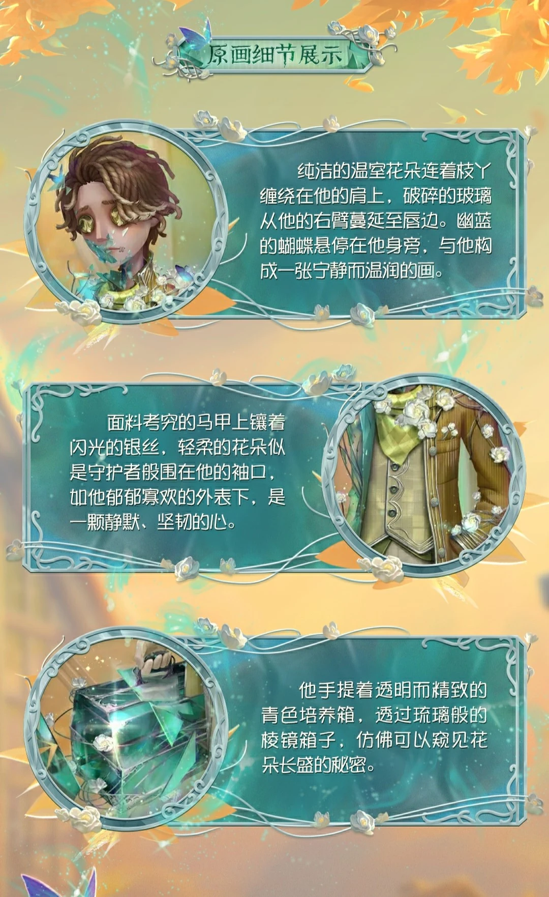[S Costume] Embalmer - "Greenhouse", pure greenhouse flowers wrapped around his shoulders with their branches, broken glass spread from his right arm to his lips. Blue butterflies hovered beside him, forming a peaceful and warm picture with him. The vest made of exquisite fabrics was inlaid with glittering silver threads, and the soft flowers seemed to be guarding his cuffs. Under his gloomy appearance, there was a silent and tough heart. He carried a transparent and delicate cyan incubator in his hand, and through the glass-like prism box, it seemed that he could glimpse the secret of the flowers' growth.