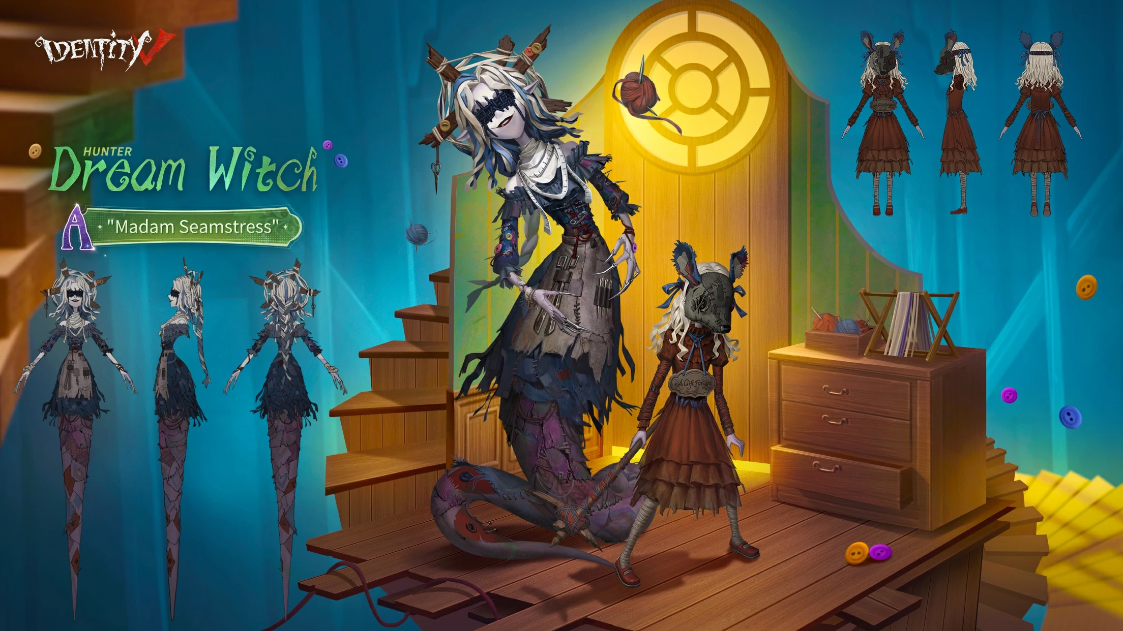 The A Costume of the Logic Path this season is the Dream Witch - "Madam Seamstress". Dream Witch wears a dark blue cloth skirt full of patches and buttons, a broken wooden strip on her head, a tattered gray apron, and a ruler around her neck, so that she can work anytime and anywhere. The follower around her wears a cloth mask, and her red skirt is a little yellowed, but she is very neatly dressed. The weapon in her hands is wrapped with red wool and blue ropes, which are the most common accessories in tailor shops.