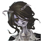 Melly is a pale, gaunt figure reminiscent of a fairy. Her braided hair is undone, with the two longest bangs dangling down her face like antennae. Her insectoid eyes are light olive with mantis-like pseudopupils, long eyelashes, and purple veins. Silver antennae poke out of her forehead, the right antenna slightly longer than the left. A dark, purplish scar is visible on her left cheek. Her right hand has a silvery, clawed exoskeleton. Her left hand is clawed but remains skin.The skin on her chest is bruised. Sprouting from her back is a pair of massive insectoid wings comprised of a bee swarm. They are black and foggy in texture, with the edges bearing holes.