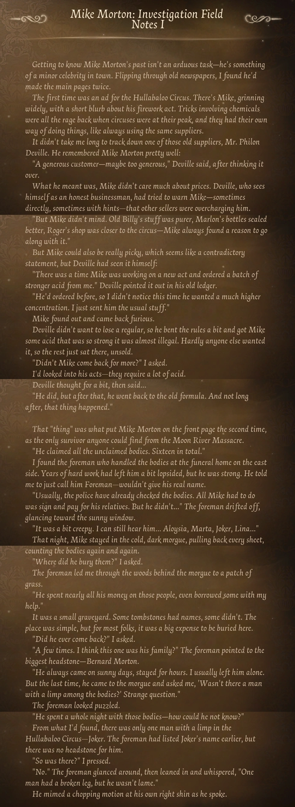 Mike Morton is the most popular guy in the traveling circus "Hullabaloo". He has curly blond hair and a lively temperament, and one will never see any sadness in his blue eyes. "Hullabaloo" is Mike's world, and there should not be other things in that world, such as killing. After surviving the disaster, Mike Morton's only goal is to find the real killer who destroyed his home.[5]
