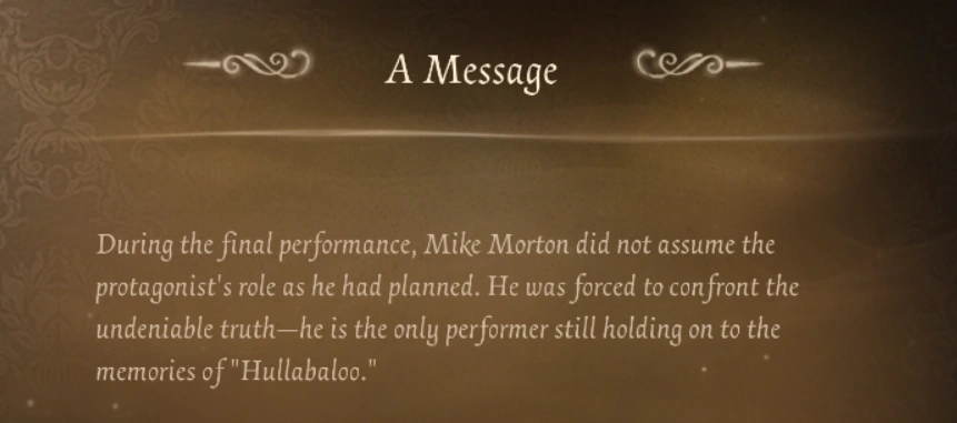 During the final performance, Mike Morton did not assume the protagonist's role as he had planned. He was forced to confront the undeniable truth—he is the only performer still holding on to the memories of "Hullabaloo."