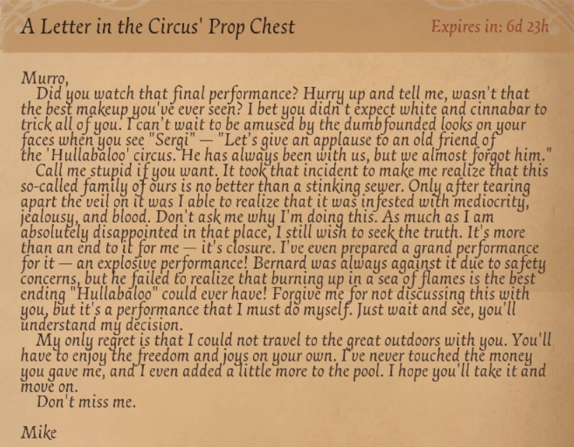Call me stupid if you want. It took that incident to make me realize that this so-called family of ours is no better than a stinking sewer. Only after tearing apart the veil on it was I able to realize that it was infested with mediocrity, jealousy, and blood. Don't ask me why I'm doing this. As much as I am absolutely disappointed in that place, I still wish to seek the truth. It's more than an end to it for me — it's closure. I've even prepared a grand performance for it — an explosive performance! Bernard was always against it due to safety concerns, but he failed to realize that burning up in a sea of flames is the best ending "Hullabaloo" could ever have! Forgive me for not discussing this with you, but it's a performance that I must do myself. Just wait and see, you'll understand my decision.