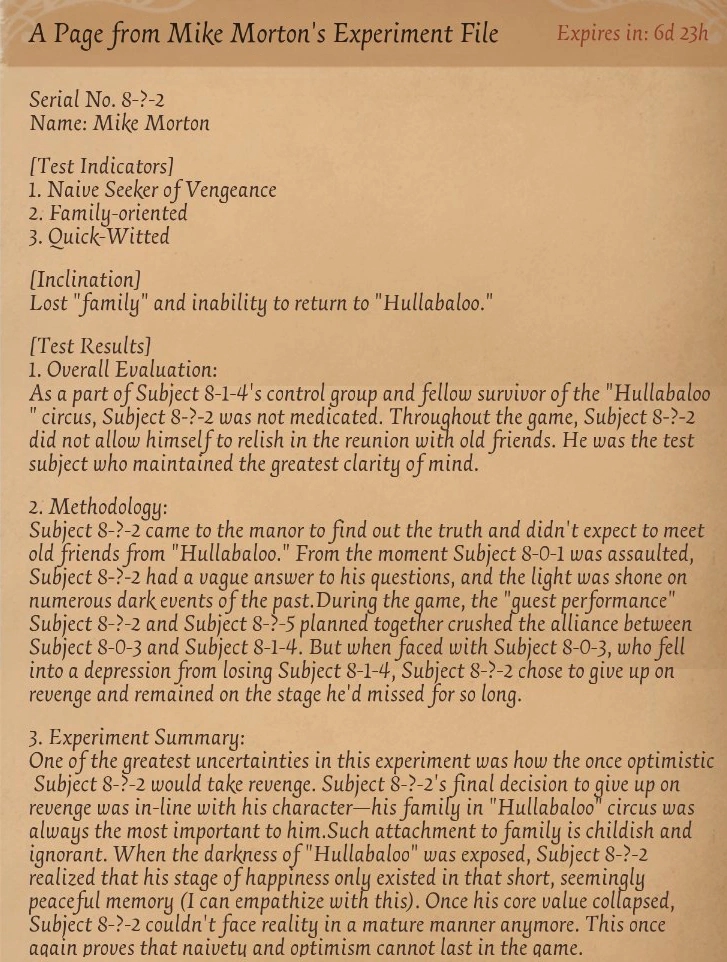 Subject 8-?-2 came to the manor to find out the truth and didn't expect to meet old friends from "Hullabaloo." From the moment Subject 8-0-1 was assaulted, Subject 8-?-2 had a vague answer to his questions, and the light was shone on the numerous dark events of the past. During the game, the "guest performance" Subject 8-?-2 and Subject 8-?-5 planned together crushed the alliance between Subject 8-0-3 and Subject 8-1-4. But when faced with Subject 8-0-3, who fell into a depression from losing Subject 8-1-4, Subject 8-?-2 chose to give up on revenge and remained on the stage he'd missed for so long.