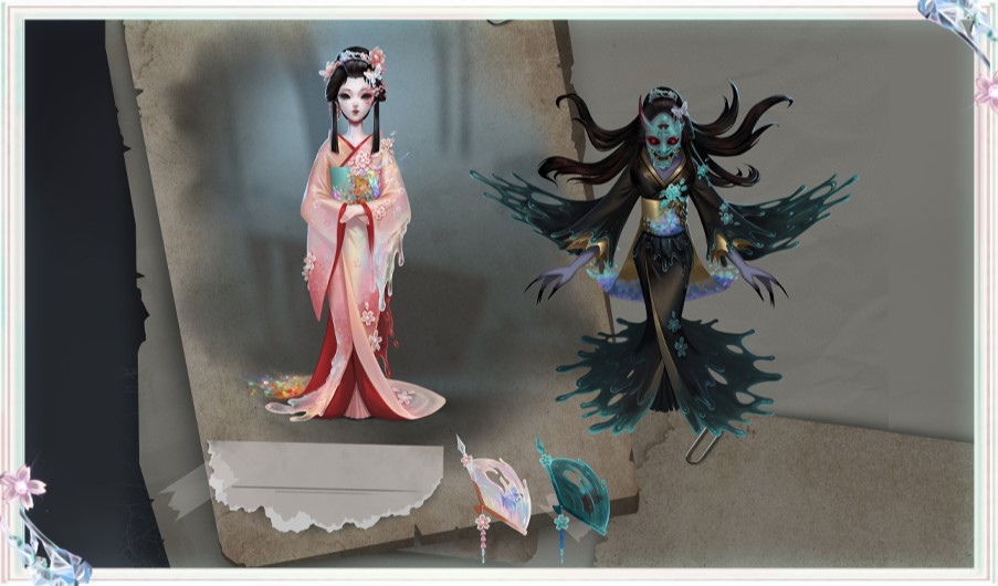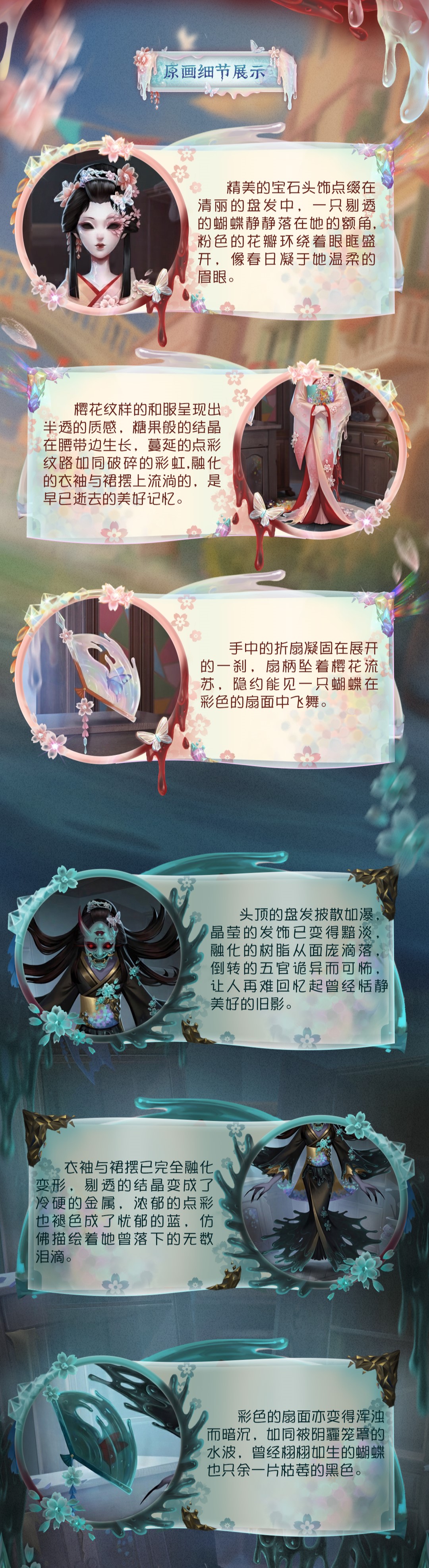 [A Costume] Geisha - Amber Tears (Prajna Form), the hair on her head is scattered like a waterfall, the crystal hair accessories have become dim, the melted resin drips from her face, and the inverted facial features are weird and terrifying, making it difficult for people to recall the once peaceful and beautiful old image. The sleeves and skirt have completely melted and deformed, the clear crystals have turned into cold and hard metal, and the rich dots have faded into a melancholy blue, as if depicting the countless tears she has shed. The colorful fan has also become turbid and dark, like a water wave shrouded in haze, and the once lifelike butterfly has only a withered black.