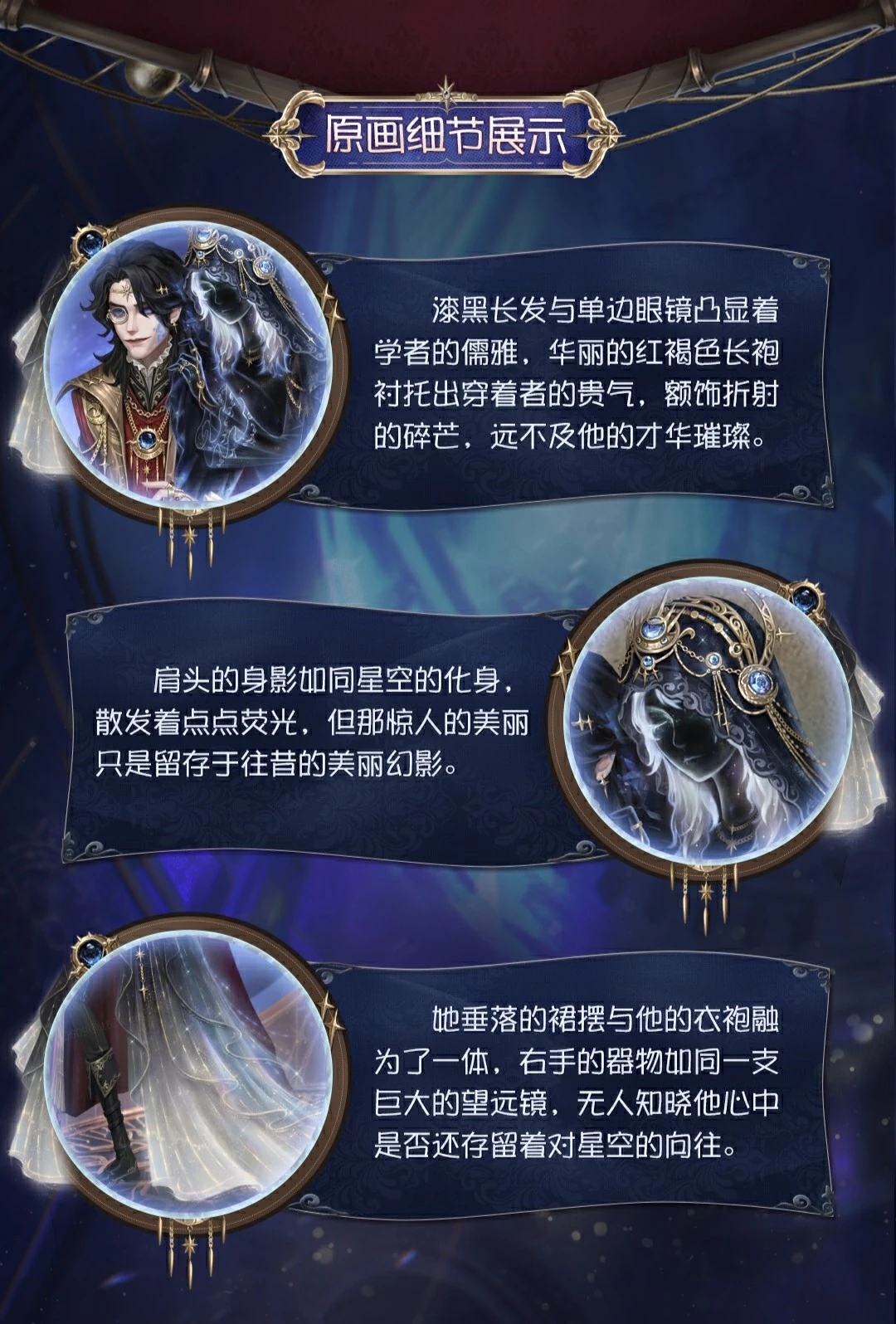 In the anniversary essence trailer, the members of the stargazing club dressed up and waited for the moment to come. In the dark night, the sea of stars was shining brightly. The Wax Artist - Astrologer manipulated the star map, the "Psychologist" - Everlasting Dream and the Patient - Tracing Light stood side by side, the slightly anxious gaze of the Professor - Bard and the silent contemplation of the Opera Singer - Lady of Dawn formed a huge contrast, and the detective never missed a moment behind them...