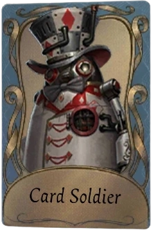 Card Soldier is a B-Tier Costume for the Guard 26, Bonbon. It was introduced in Season 8 after the release of the 2nd Essence as Guard 26's initial release costume on the Illusion Hall.