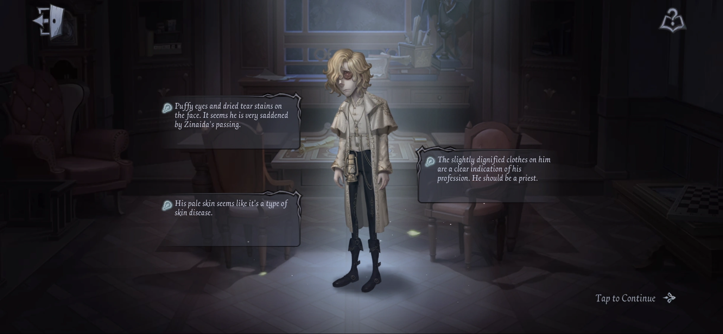 | (Everyone takes the tear catcher from D.M. I've read about this custom. In the local religion of this area, people shed one last year for the deceased during the funeral and store it in a blessed vial. The tear can represent longing or even repentance. Once it's sealed in the vial, all yearning and debts will be isolated beyond this world.) (Meanwhile, Pastor reorganizes his emotions and starts to read the eulogy. Unlike his timid self from before, once he got to work, he seemed so staunch, as if he was a completely different person.) | |