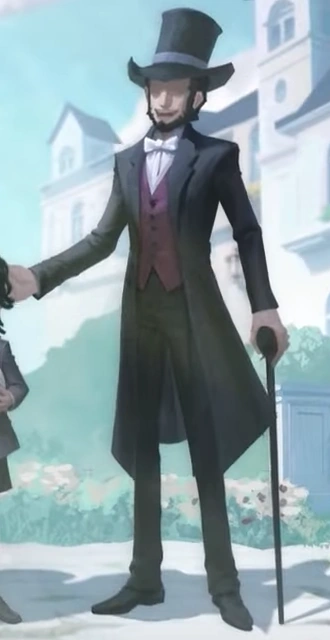 Charlie is a man with dark short hair with a beard. He wears a black long suit jacket with a dull red vest and a white shirt with a white bow-tie. He also wears dark suit pants and shoes and a black top hat with a blue ribbon. He holds a brown cane in his left hand.