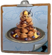 Croquembouche consists of a large, off-white ceramic plate, atop which sits a huge heap of golden choux pastry puffs piled into a large cone and bound with delicate threads of golden caramel, and garnished with a generous amount of chocolate ganache, honey, and blueberries. A Grappling Hook is also nestled into the top of the pile.