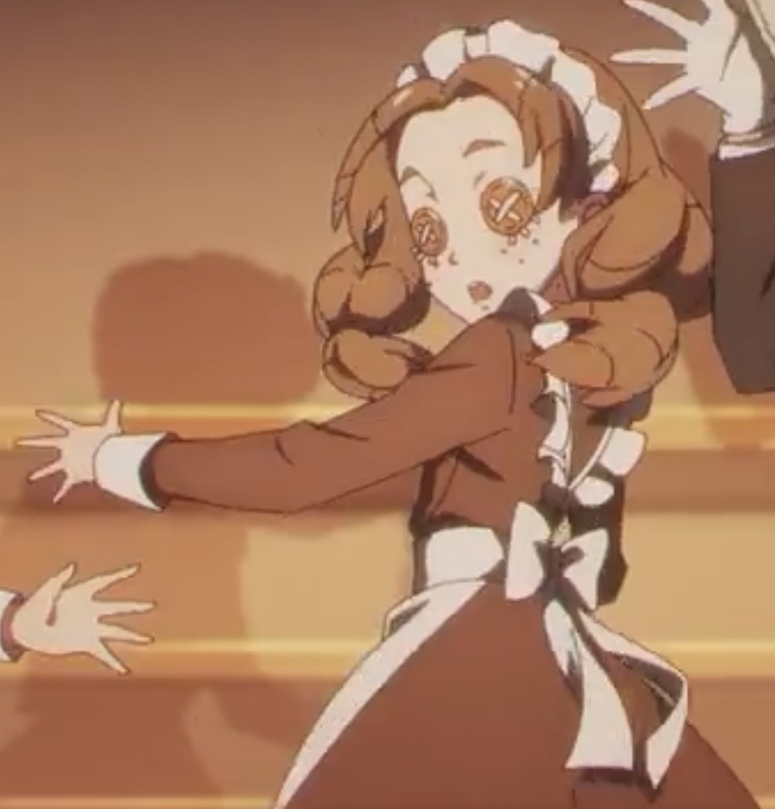 Daisy is a slender and petite young lady with fair skin that is described as lovely and cute in appearance. She has mid-length brown hair tied into two low pigtails with middle-parted curtain bangs framing her face. Her button eyes are chestnut brown with a white cross stitch and she has several freckles on her cheeks. She wears a classical-style maidservant uniform, consisting of an ankle-length black dress with long sleeves, white cuffs and a white collar, along with a white apron with ruffles around the sleeves that is tied into a white bow at the back. In addition, she wears white socks and simple black Mary-Jane style shoes.