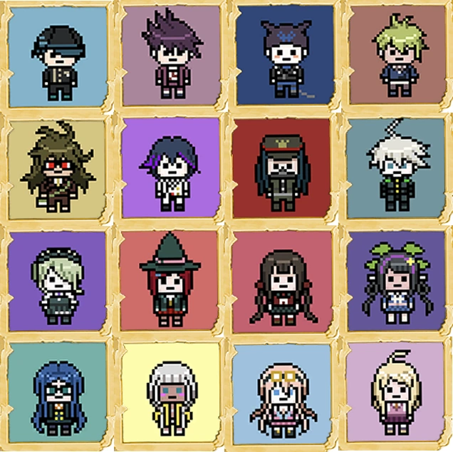 These sprites are likely taken from each of the three games' respective new game plus modes: School Mode, Island Mode, and the Ultimate Talent Development Plan, where the characters are represented by 8-bit sprites of themselves.