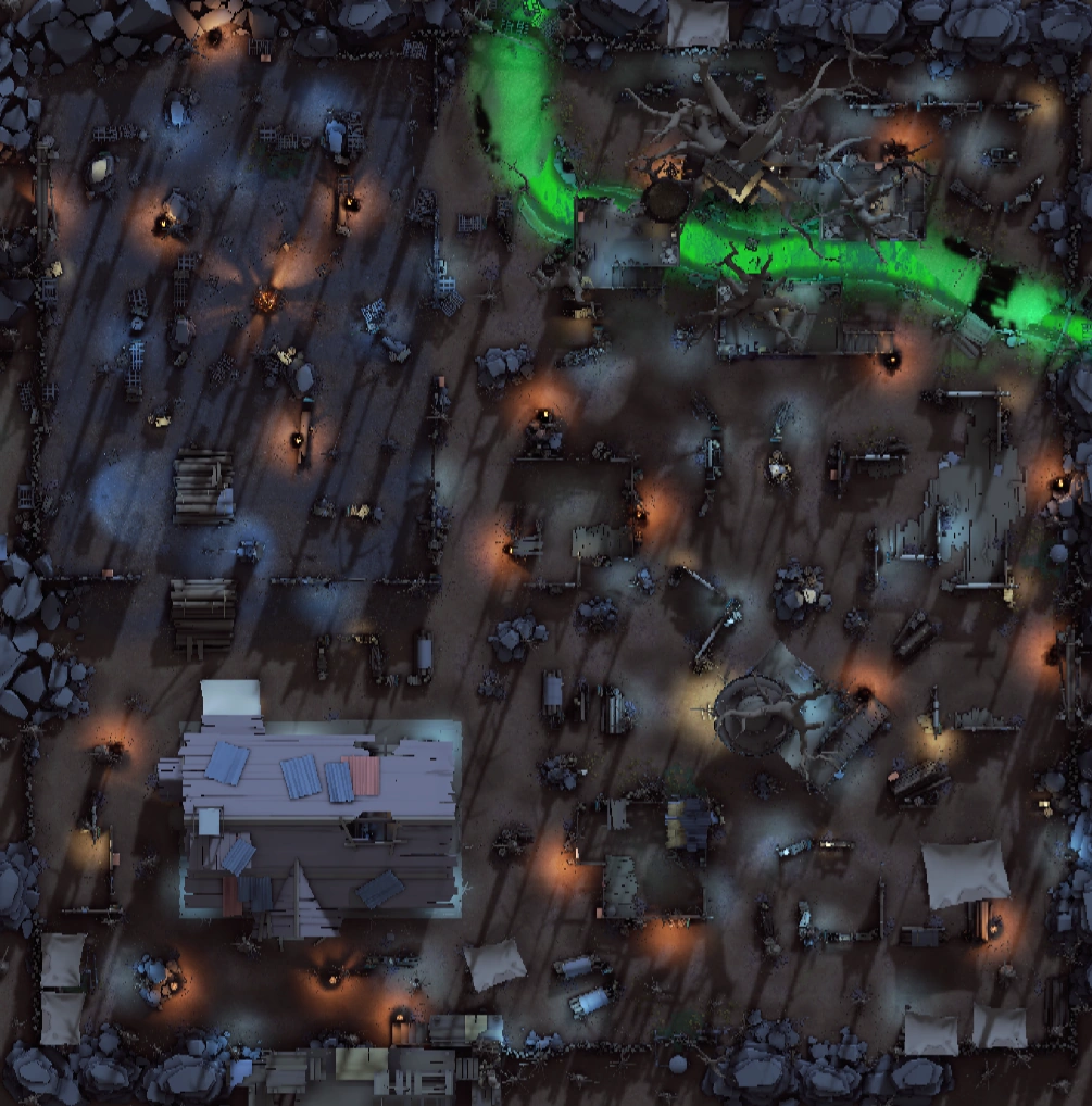 All along the Eastern side of the map are ruined wooden walls, all that is left of old buildings. Additionally, the ruins of two larger shacks are in the center of the map.