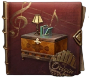 This piece of furniture is a medium-large rectangular dresser made of dark wood and marbled red-brown wood panels, and with four curved legs underneath the main box. It has a latch in the front which would allow the wooden lid to be lifted. The front panel of the chest is decorated with a symmetrical dark red rippling pattern pattern, and the 1800 origins emblem is at the bottom front. On top of the dresser is a simple curvy bronze lamp with a cream-colored lampshade, and three blue hardcover books held up by a bookstand.