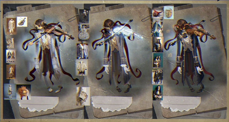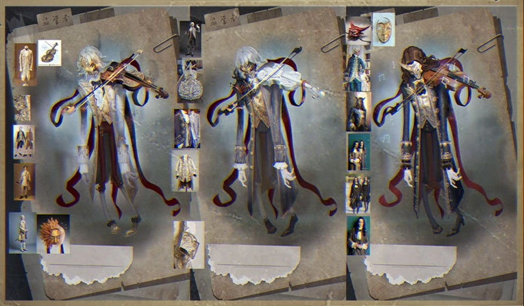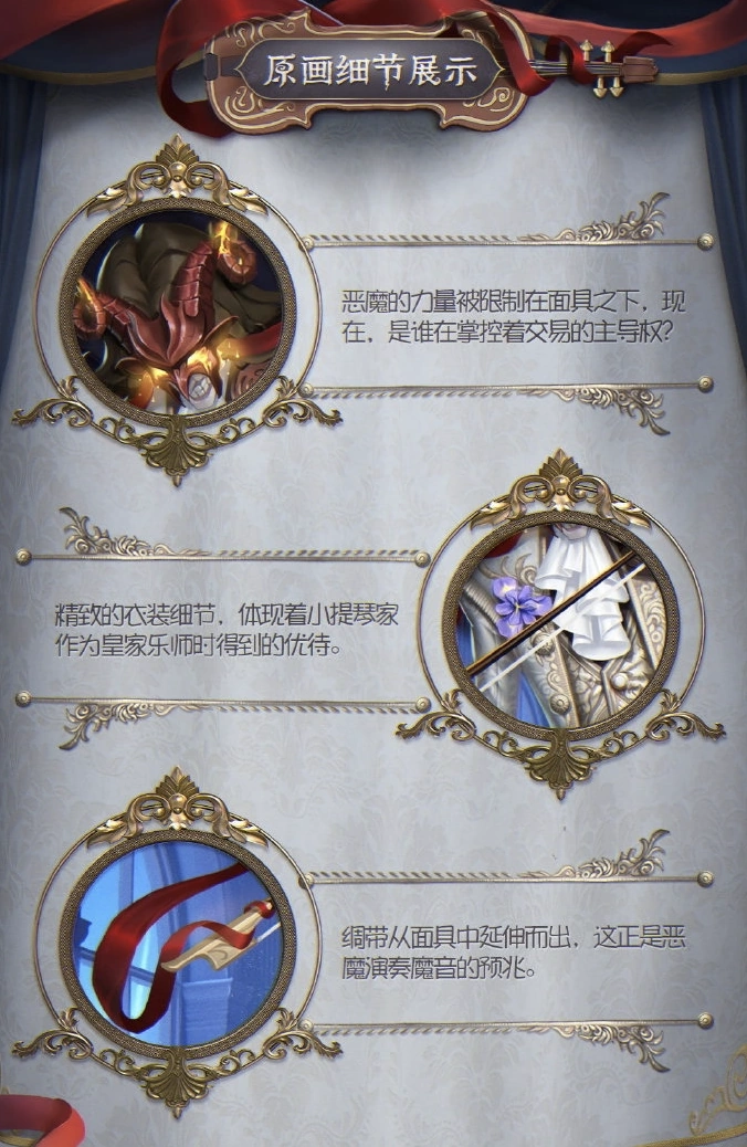 On the basis of the above, we optimized the design and overall improved the texture of the characters and pictures. Remove some modern features from the clothing to restore the characteristics of the times. The ribbons and patterns have also been optimized, and special effects designs on masks, violins and musical notes have also been added to make the picture more impactful.