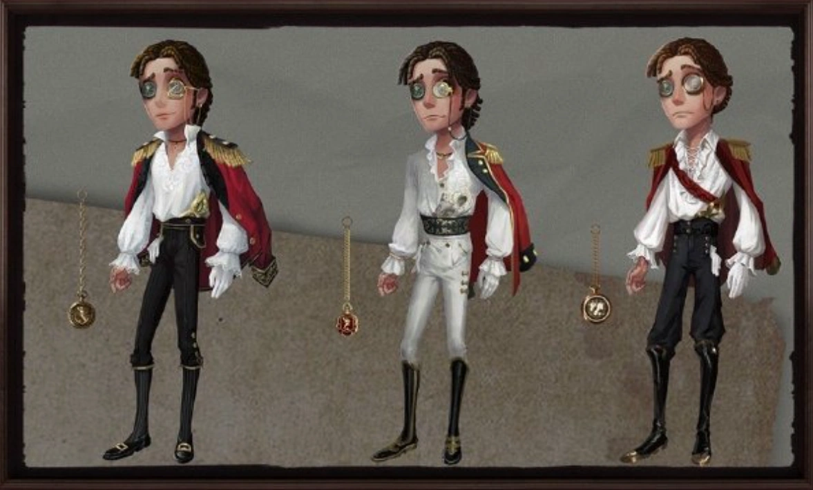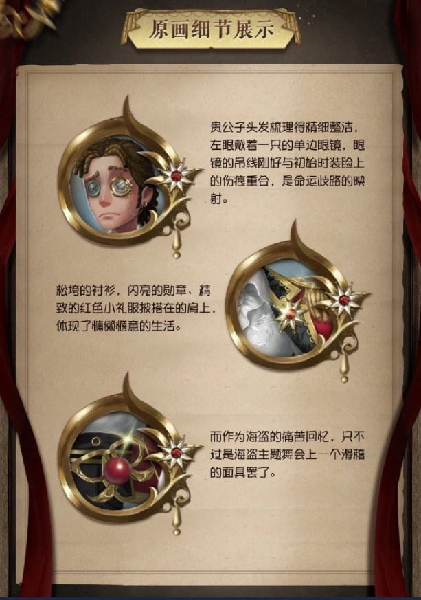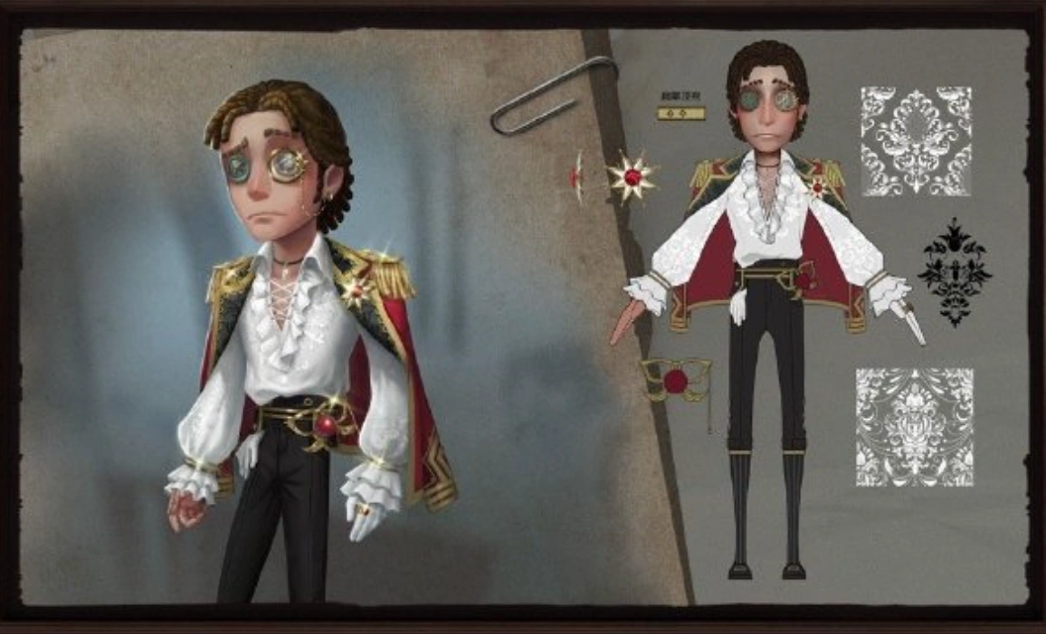 The red military-style dress was draped casually over his shoulders. A gold medal represented the awards he had received. A hollow pirate mask was pinned to his waist, hinting at the Baden family's past as pirates, but those painful memories have been forgotten. Forget that the wealthy new aristocracy is their current identity.