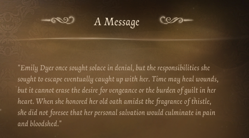 "Emily Dyer once sought solace in denial, but the responsibilities she sought to escape eventually caught up with her. Time may heal wounds, but it cannot erase the desire for vengeance or the burden of guilt in her heart. When she honored her old oath amidst the fragrance of thistle, she did not foresee that her personal salvation would culminate in pain and bloodshed."