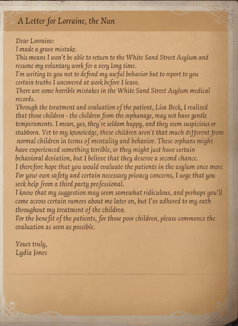 I therefore hope that you would evaluate the patients in the asylum once more. For your own safety and certain necessary private concerns, I urge that you seek help from a third party professional.