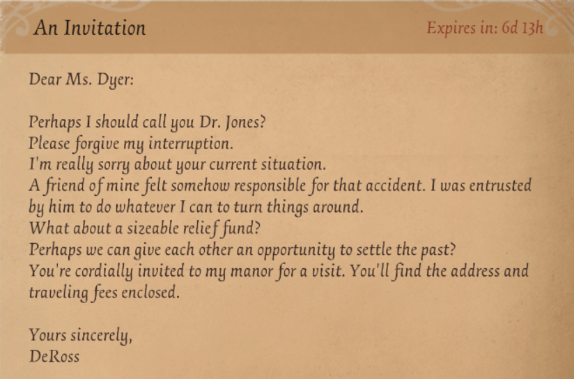 You're cordially invited to my manor for a visit. You'll find the address and traveling fees enclosed.