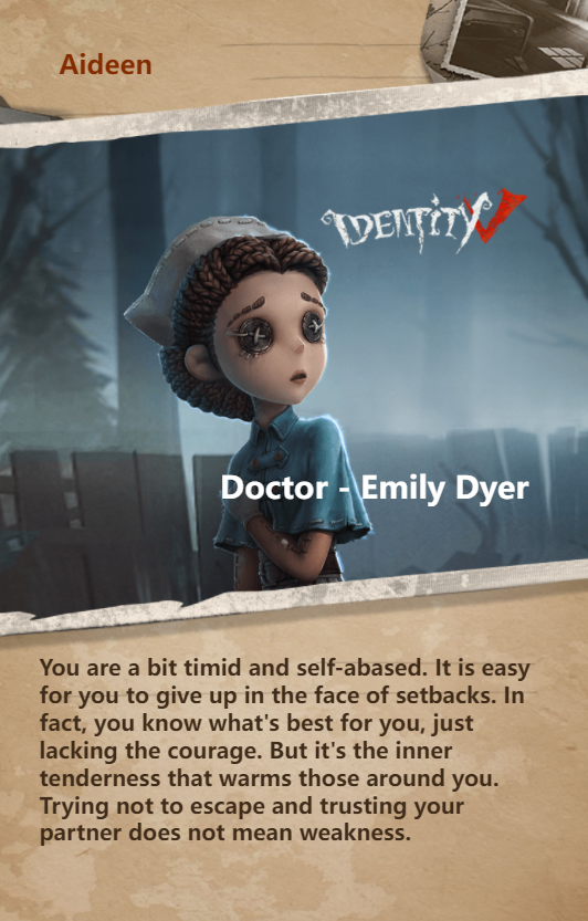- Note: These Deductions Quests and their related images are from Identity V's Beta Testing period[7], and may not reflect the current story of Emily Dyer. The original Chinese text for the Deductions is included in the table that follows, and translations for the unused images can be found below.