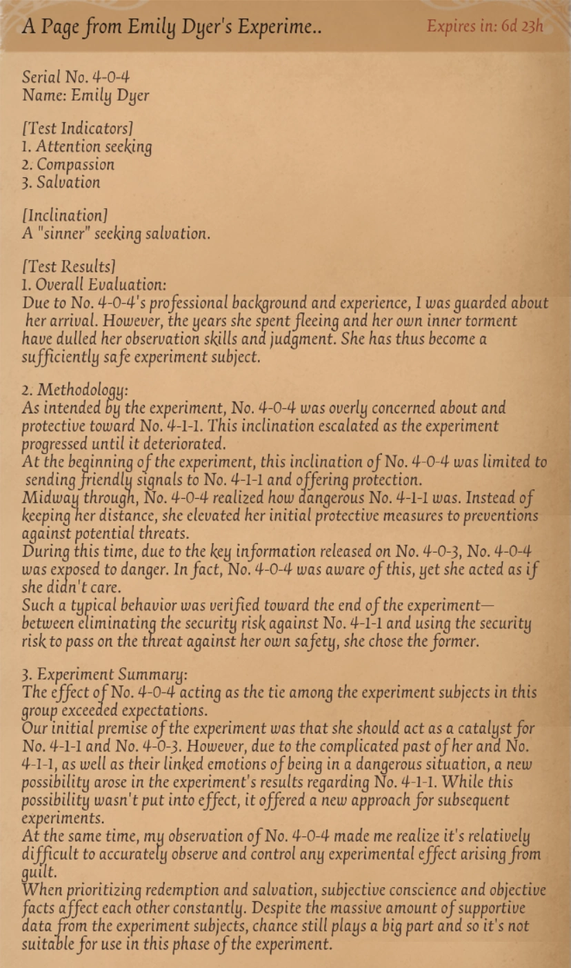 Due to No. 4-0-4's professional background and experience, I was guarded about her arrival. However, the years she spent fleeing and her own inner torment have dulled her observation skills and judgment. She has thus become a sufficiently safe experiment subject.