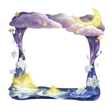 The Portrait Frame depicts a dark blue water surface at its base, in which several glowing yellow stars are partially submerged. The stars' light is reflected on the water, and ripples are emitted from their locations. Two water columns rise at its edges, fading from blue to purple, with numerous white flowers being pulled upwards. The Frame's top edge is composed by a layer of purplish clouds, visible behind an array of small glowing stars and with a bright crescent moon partially hidden among them.