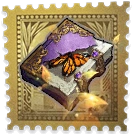 The accessory is a hollow book with a purple cover and decorative golden book corners and slots. The slots have purple stones on top of them on the front side of the book. Half of the front cover is missing, showing the pinned monarch butterfly inside of the book.