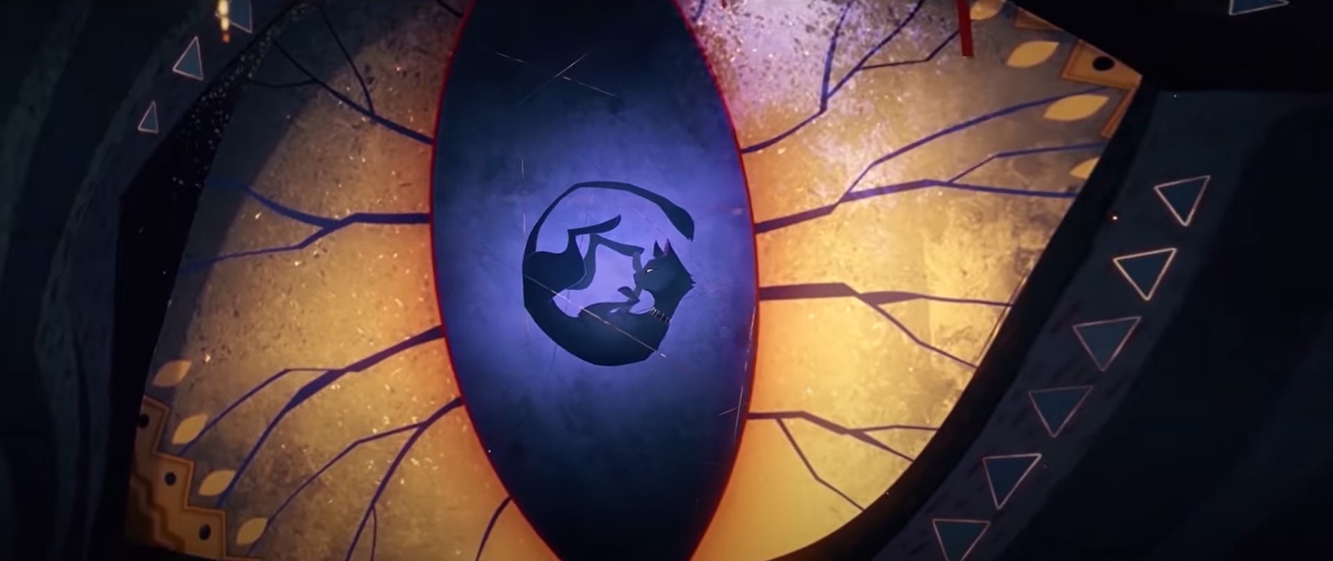 In Amanda's trailer, it has a colossal vertical pupil radiating golden light from its amber eyeball. Surrounding it are deep red and dark smoke filling the sky with malice in its physical form.