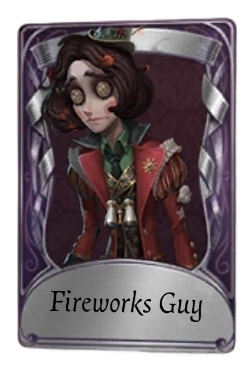 - Fireworks Guy wore a red coat line with elaborate gold stitching, an a pair of lens used for studying gunpowder hang on his chest.