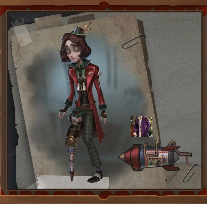 The Weeping Clown Joker plays the role of the "Fireworks Guy", who is based on firework products and brands that have appeared at the historic Crystal Palace Fair. In the grand Crystal Palace, Fireworks Guy and his fireworks store are representatives of fun. The mask, hat, and prosthetic leg are all detailed to make the firework elements more realistic, and appear more fun.