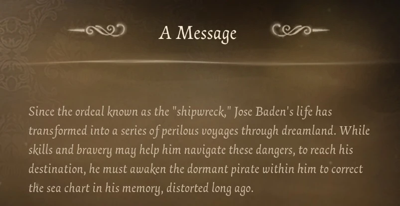 Since the ordeal known as the "shipwreck," Jose Baden's life has transformed into a series of perilous voyages through dreamland. While skills and bravery may help him navigate these dangers, to reach his destination, he must awaken the dormant pirate within him to correct the sea chart in his memory, distorted long ago.