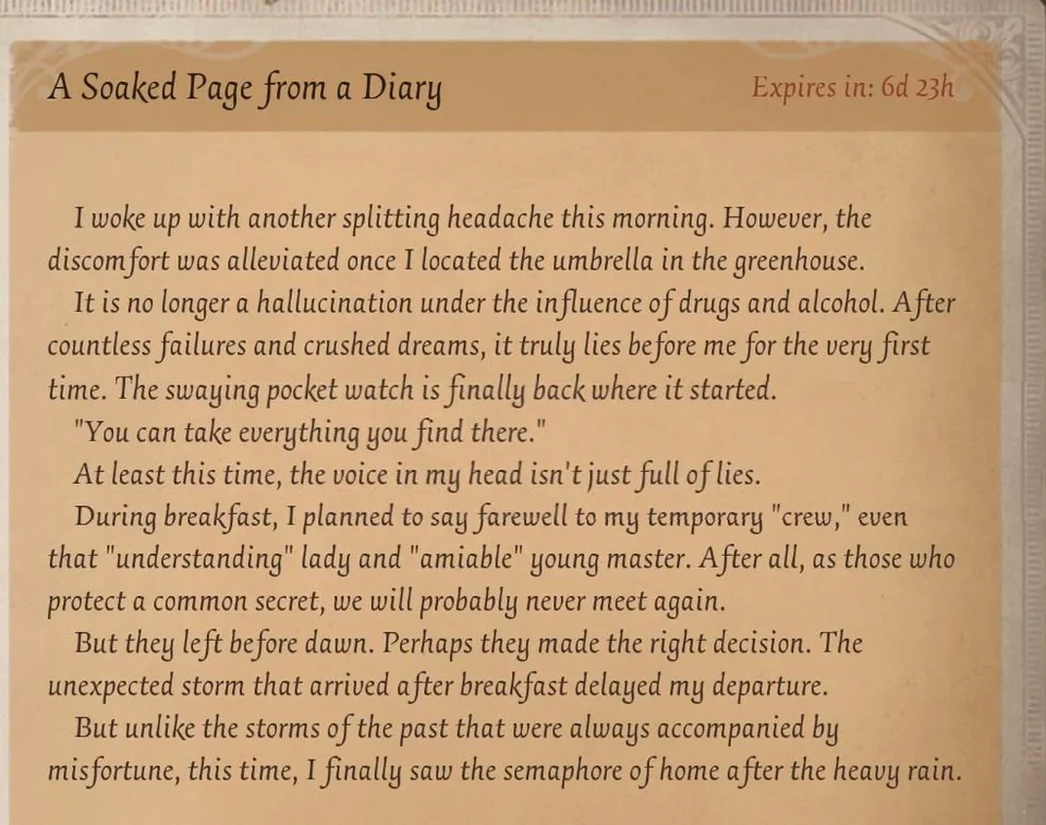 First Officer Jose Baden and his father, the captain, escorted the King of England's maritime empire. However, one day, Baden was delayed in Liverpool and did not go out to sea with his father. At sunset, he waited for his father at the port, but the ship that was carrying antiques for the King of England did not return on time. Soon Jose received news that there was an antique umbrella from China on the cargo list of the missing ship, and now it appeared in a place called Oletus Manor. The former sea knight decided to step into this cursed land himself to find his father's whereabouts, or at least... take back what belongs to him.[7]
