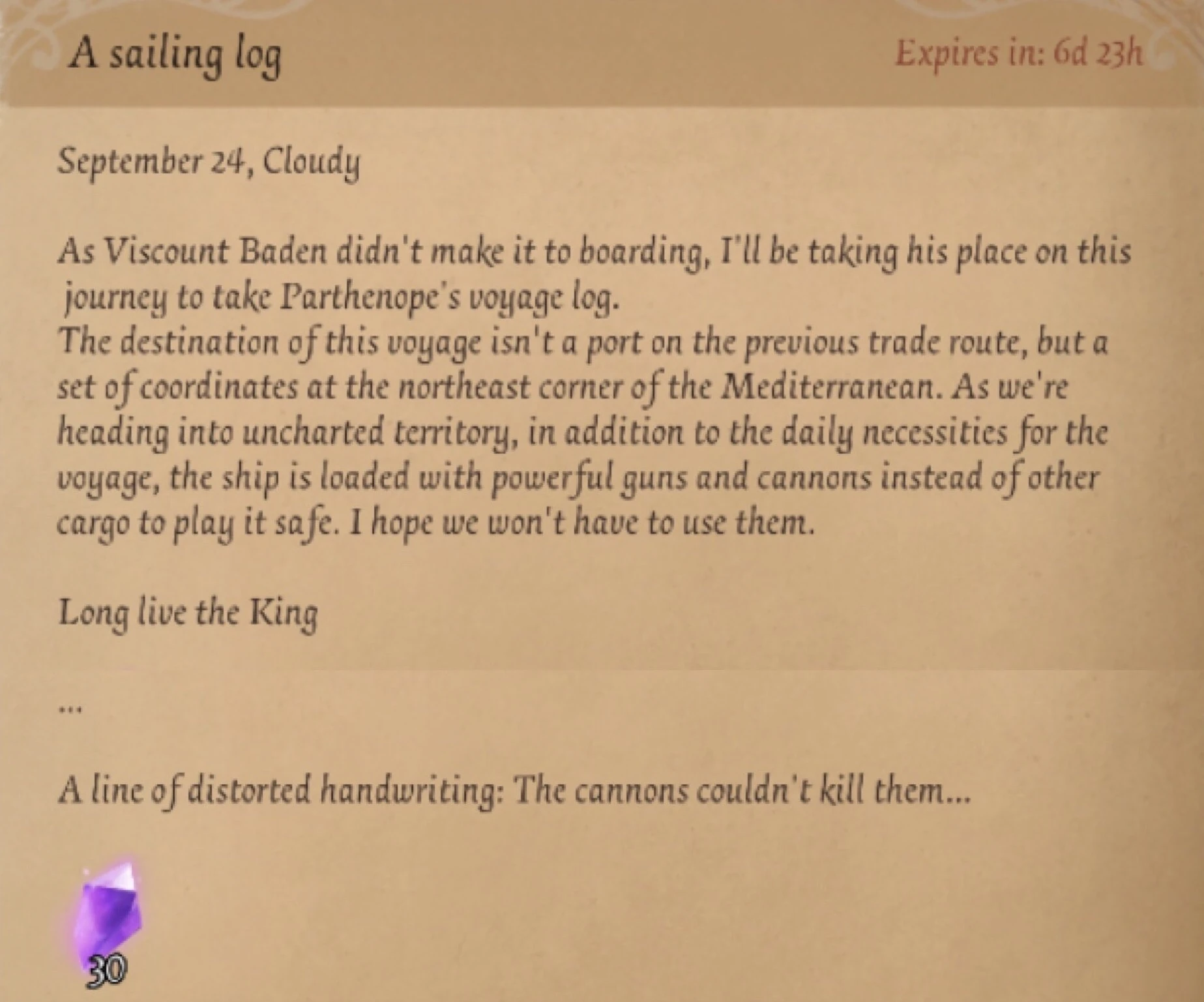 The destination of this voyage isn't a port on the previous trade route, but a set of coordinates at the northeast corner of the Mediterranean. As we're headed into uncharted territory, in addition to the daily necessities for the voyage, the ship is loaded with powerful guns and cannons instead of other cargo to play it safe. I hope we won't have to use them.