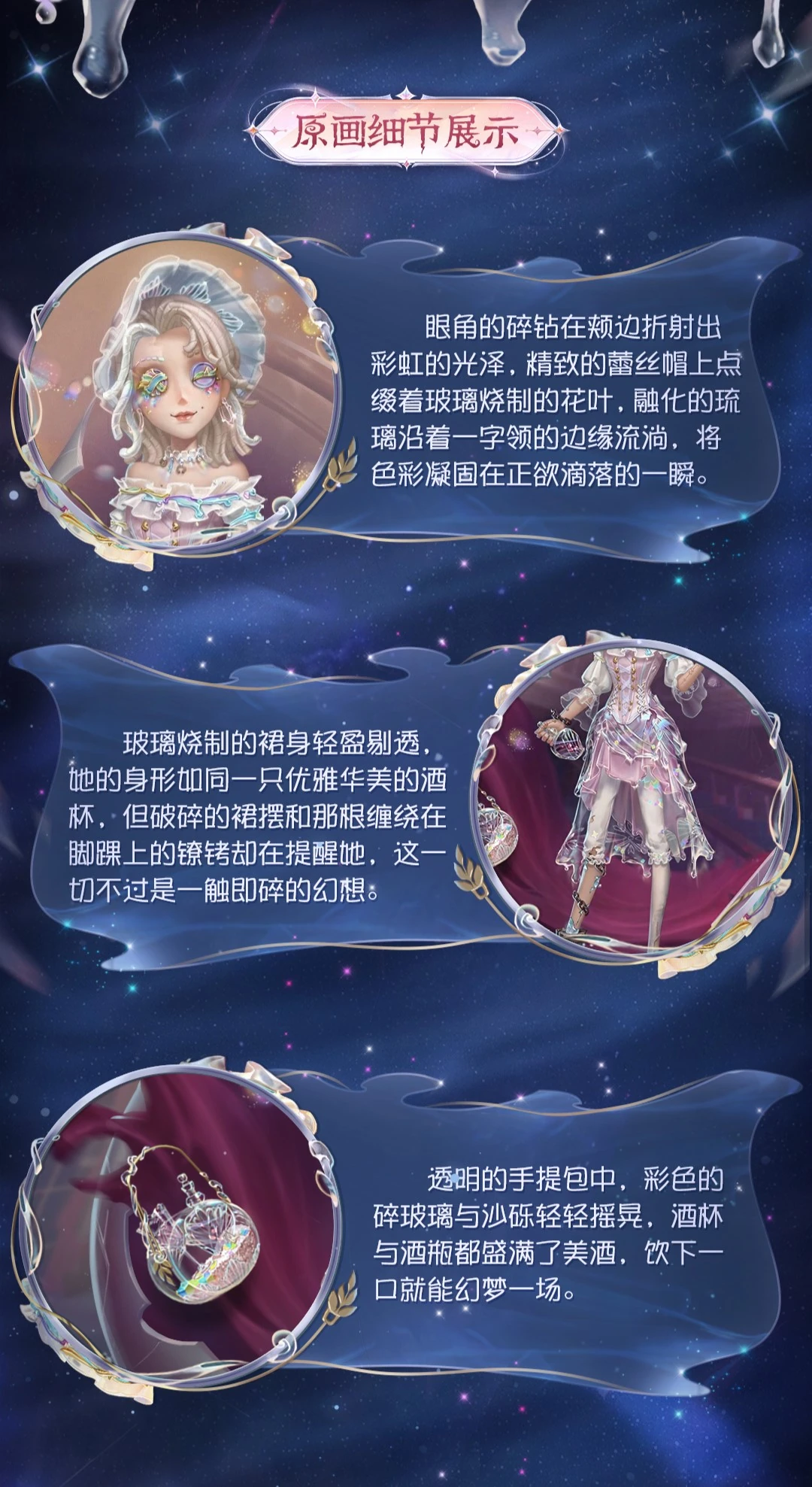 The glass skirt is light and transparent, and her figure is like an elegant and gorgeous wine glass, but the broken skirt and the shackles wrapped around her ankles remind her that all this is just an illusion that will break at any time. In the transparent handbag, colorful broken glass and gravel are gently shaking, and the wine glass and wine bottle are filled with fine wine. A sip can bring back a dream.