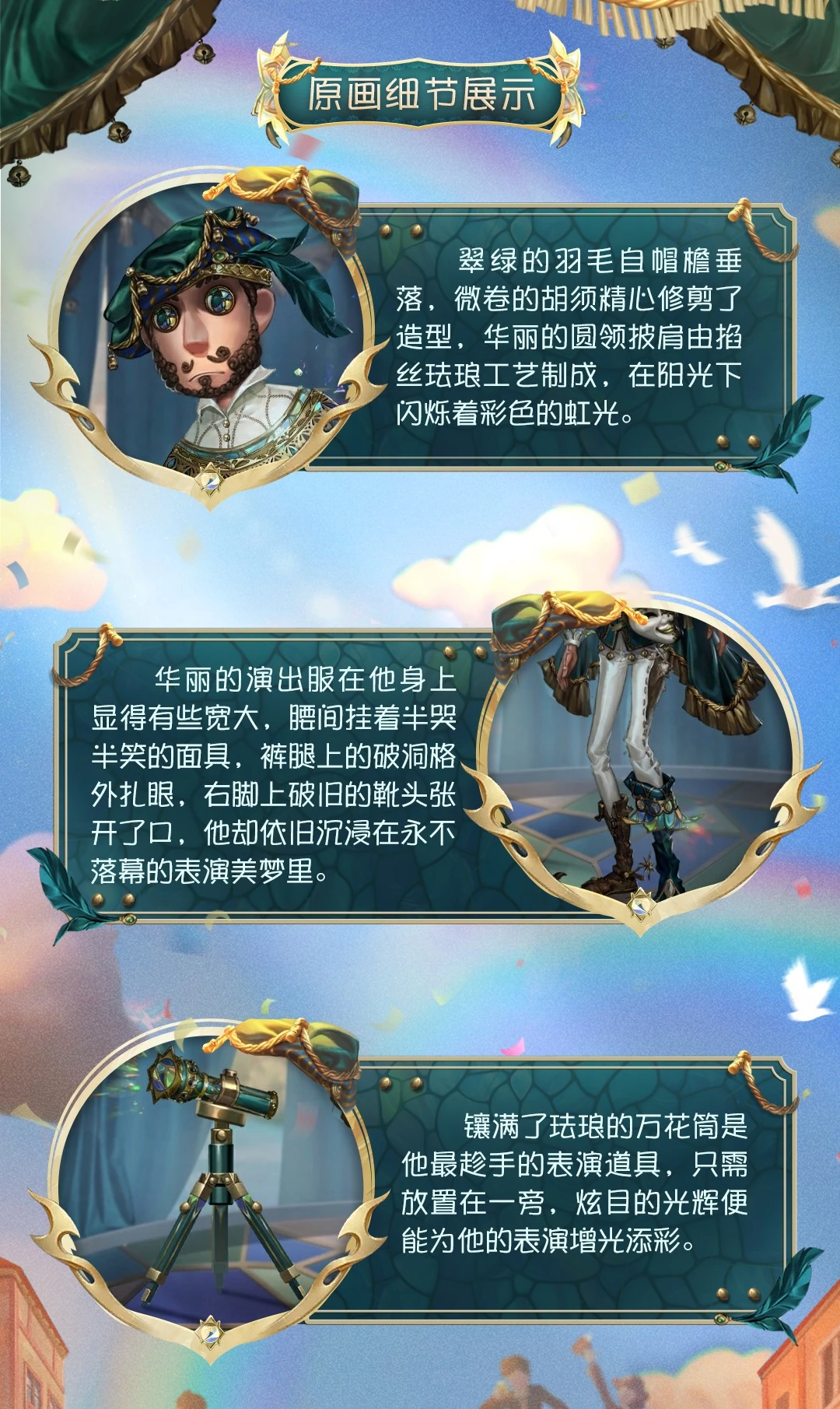 [A Costume] Thief - Gilded Showman's emerald green feathers hang from the brim of his hat, his slightly curly beard is carefully trimmed, and his gorgeous round-neck shawl is made of cloisonné enamel, sparkling with colorful rainbow light in the sun.
