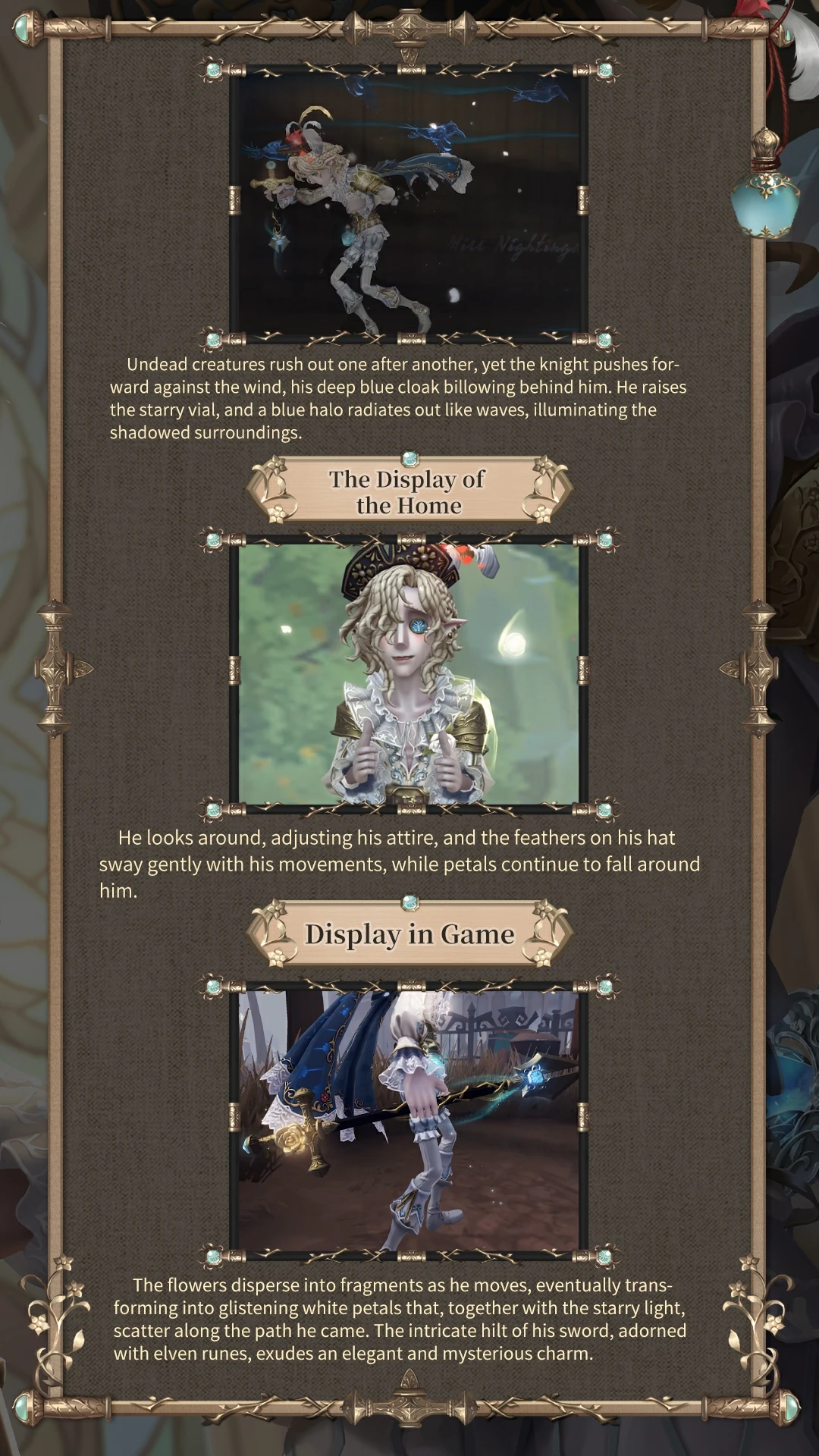 Andrew wears a white knight uniform, with feathers and flowers dotted on a black-gold knight hat, and the runes of the elves are engraved in the blue eyes. With pointy ears hidden in short satin-like hair, the melancholy knight was thinking. The lace sleeves are fluffy and light, the V-neck shirt is more romantic and free, and the metal armor shawl makes him look tougher. The starlight bottle around the waist is radiant, as if reflecting the dream of an elf. A blooming flower is cast on the hilt, and golden vines wrap around the blade. The gemstones embedded in it, like his eyes, have an unforgettable dreamy color.
