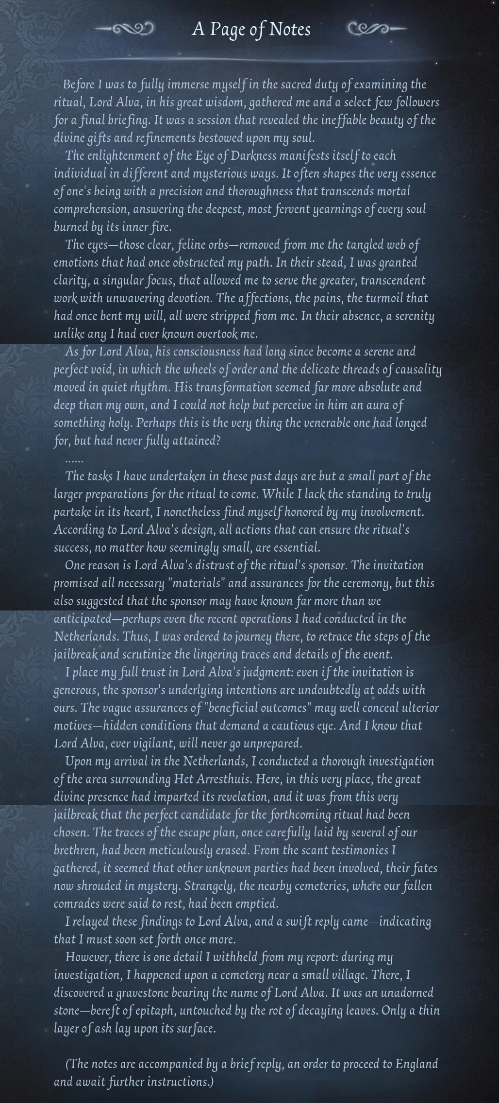 The tasks I have undertaken in these past days are but a small part of the larger preparations for the ritual to come. While I lack the standing to truly partake in its heart, I nonetheless find myself honored by my involvement. According to Lord Alva's design, all actions that can ensure the ritual's success, no matter how seemingly small, are essential.