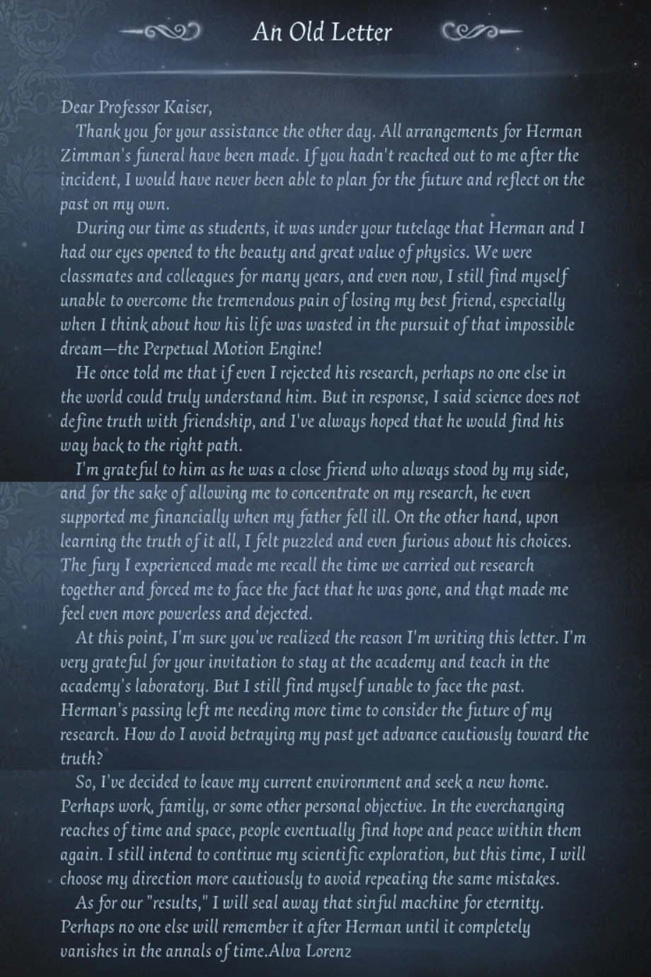 At this point, I'm sure you've realized the reason I'm writing this letter. I'm very grateful for your invitation to stay at the academy and teach in the academy's laboratory. But I still find myself unable to face the past. Herman's passing left me needing more time to consider the future of my research. How do I avoid betraying my past yet advance cautiously toward the truth?