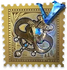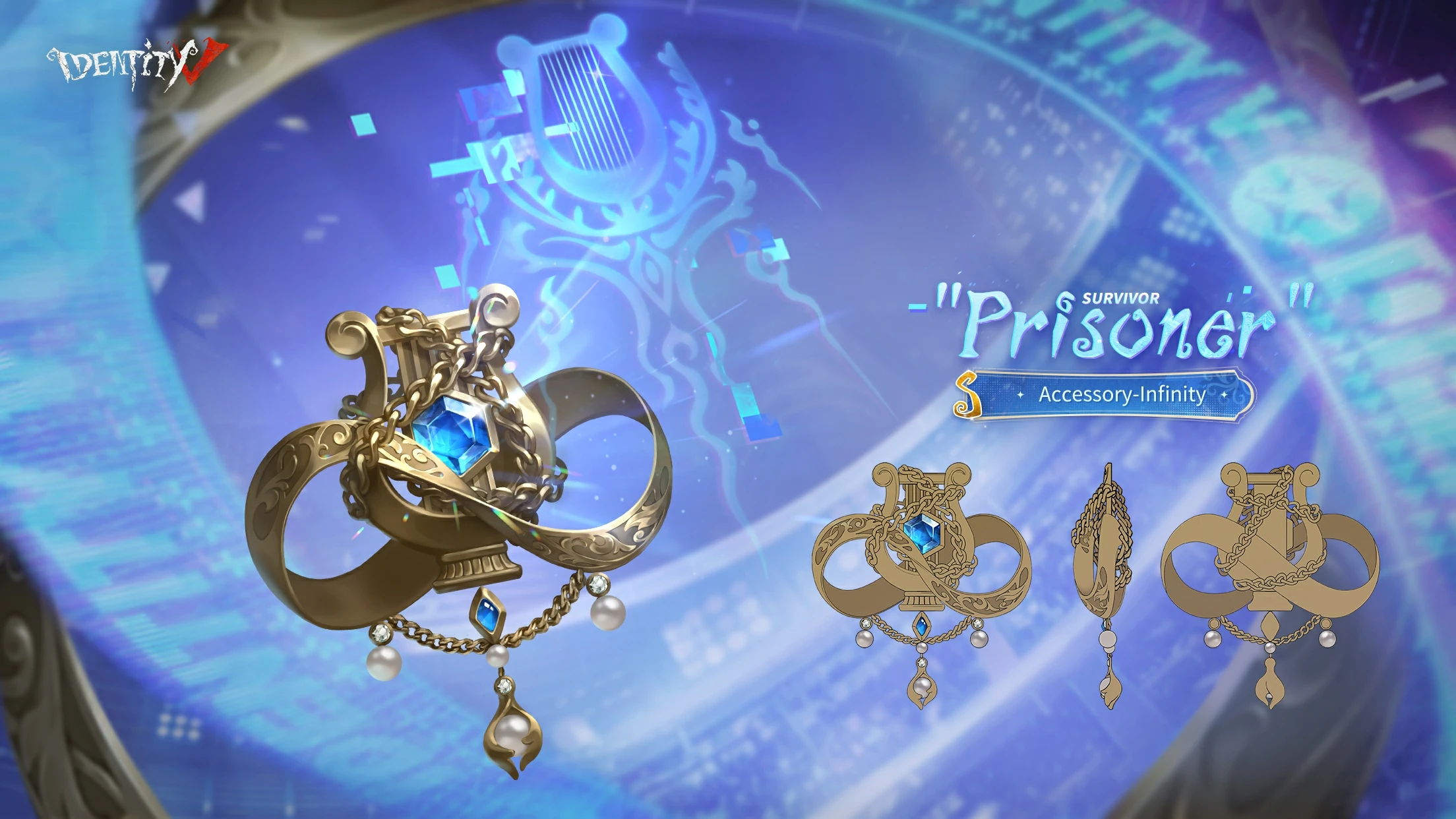 Infinity takes the form of a golden pendant that will appear on Luca's chest when worn. It is in the shape of a harp adorned with a blue gem in the center, with white pearls below it. It also has a ribbon forming the infinity symbol around the harp piece.