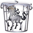 Ink Qilin is a mostly white Chinese horse with two golden horns. It has a long mane that dark gray at the tips and fades into white, with some golden strands. Its tail and hooves are also dark gray. There are also gray patches of fur on its face, legs, and chest. Its eyes have black sclera with gray and gold pupils.