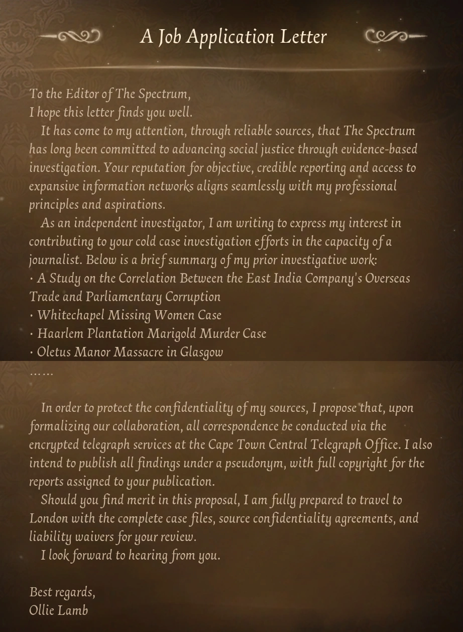 In order to protect the confidentiality of my sources, I propose that, upon formalizing our collaboration, all correspondence be conducted via the encrypted telegraph services at the Cape Town Central Telegraph Office. I also intend to publish all findings under a pseudonym, with full copyright for the reports assigned to your publication.