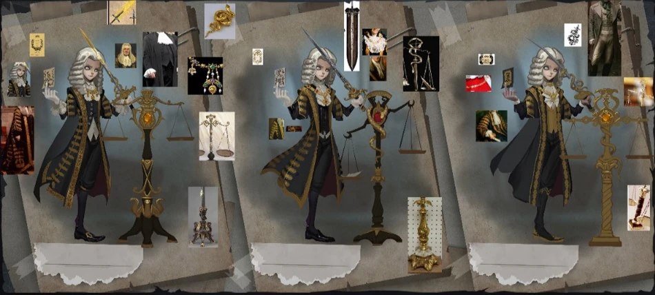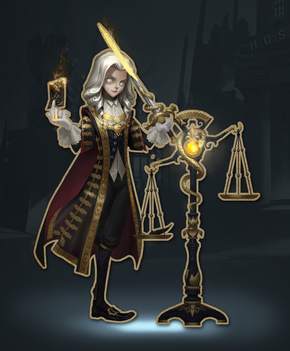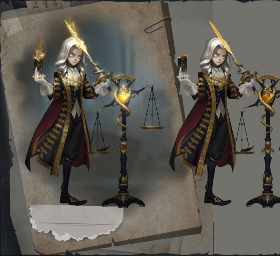His pale eyes are indifferent, shielded from worldly distractions, make him more just, insight into people's hearts; His judgment robes are black and gold, it implies the majesty of the tribunal and the severity of dealing with evil; Judge scales and snakes hovering over swords, as if winding out, ready to choose someone to eat.