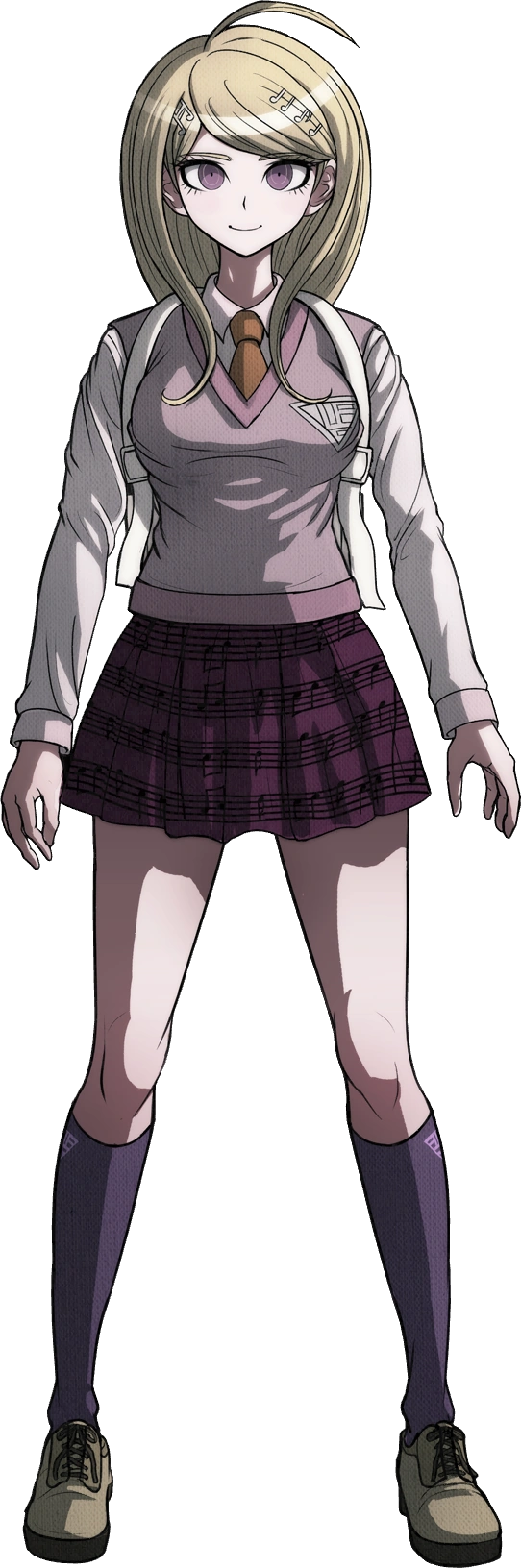 Her outfit consists of a pinkish off-white dress shirt with an orange tie, worn over with a V-necked pale pink sweater vest (having a darker hem), which has a triangular school crest on her left part of her chest. A short, dark purple skirt with four melodical patterns on them is paired with paler purple knee-high socks, bearing the same school crests on their outer sides. Tan lace-up shoes with brown soles finish the look. Alice also wears around a plain white backpack.
