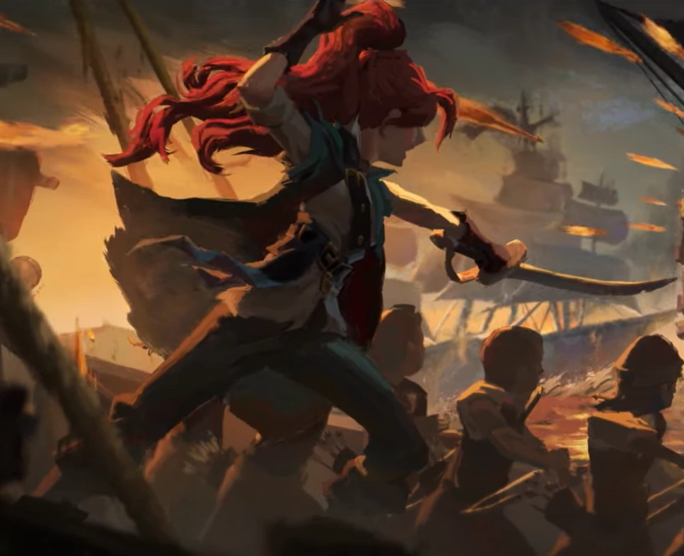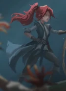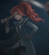 Lagertha is a young looking woman of fair skin. Her red, long, wavy hair is tied into a high ponytail with a black hair tie, her bangs are curled upwards and then swooped off to the sides. She wears a white loose plain shirt with tears at the bottom, with a dark sash around her waist, and a belt around her waist, alongside a loose blueish fabric tied underneath the waist belt. She wears brown leather gloves that cover the rest of her arms. She is wearing a long light blue coat, with torn sleeves. She has brown trousers and brown leather boots. She is typically seen with a blade or a spyglass in her hand.