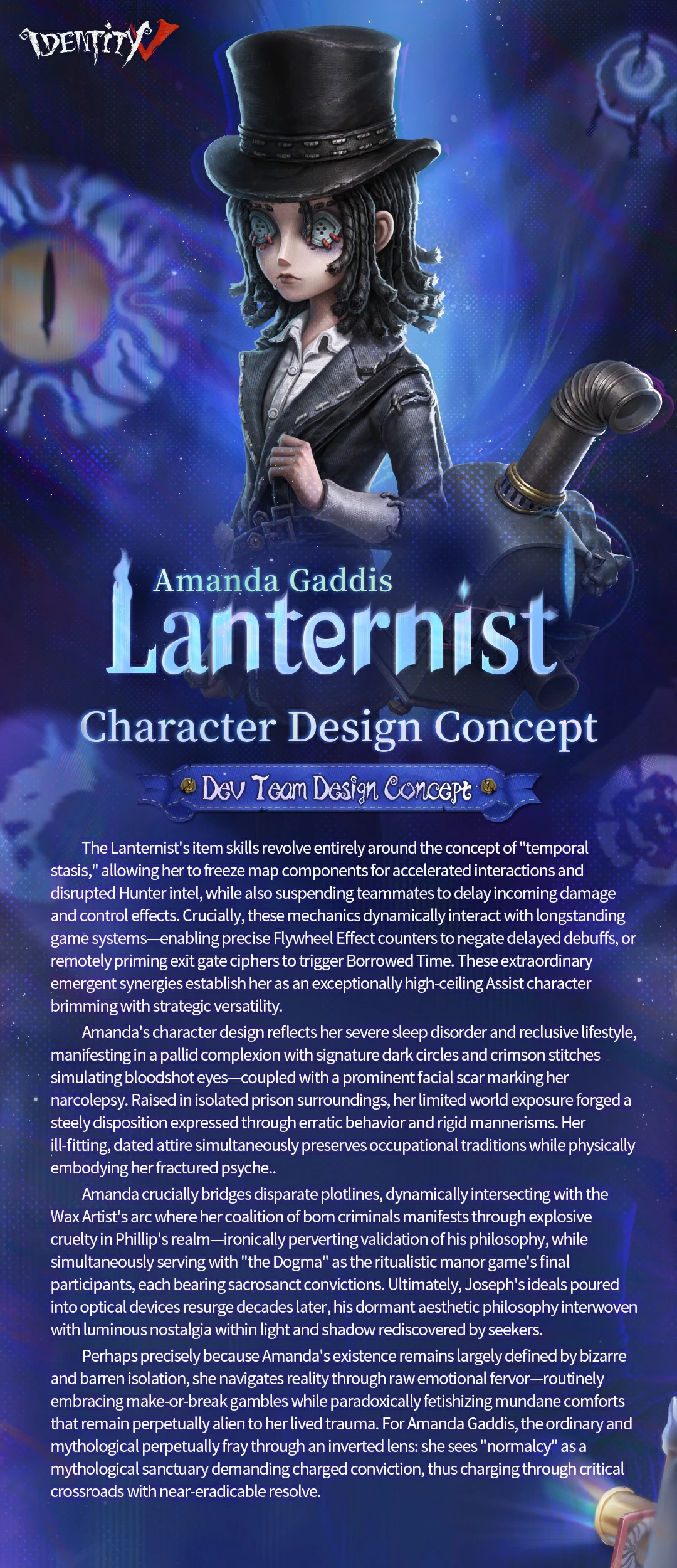 Amanda Gaddis, also known as the Lanternist, is an Assist/Contain Hybrid Type and Difficulty 2 Survivor that will be available for purchase after completion of the prologue. She is one of 50 playable Survivors added to Identity V.