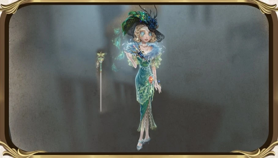 Her clothing's style is inspired from that of Edward VII's time period, which featured formal dresses and feather capes that emphasized the elegance of and curves of the female form. Lace, cords, appliqués, beads, and ruffles create ethereal layers of tulle and feathers. A peacock feather hat as well as other feathered elements are included in her clothing, consistent with the era's clothing style.