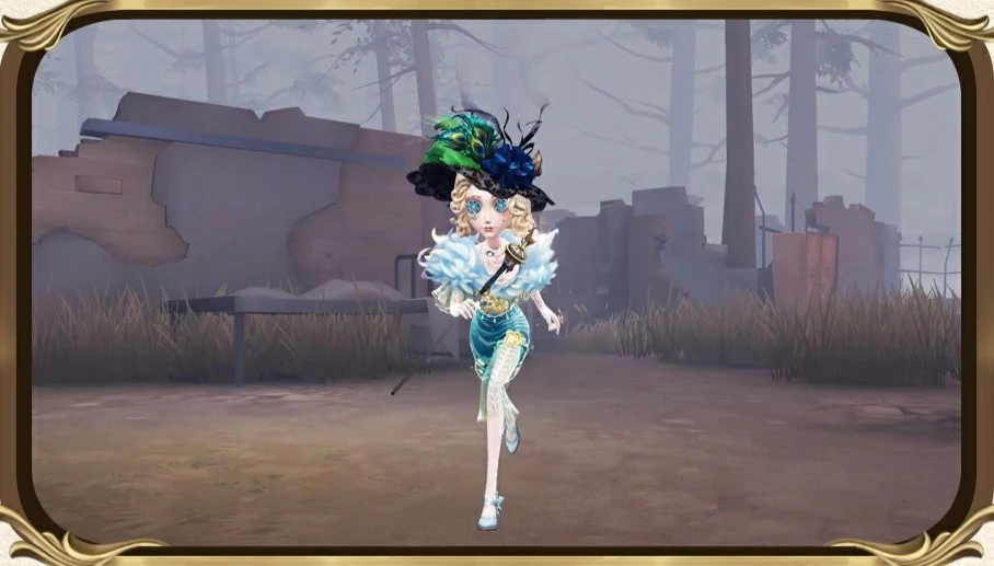 Her outfit consists of a multi-layered dress with an emerald-green, thigh-length shimmer dress that has a very high cutout to her upper thigh on her left leg, with its peak marked by a large yellow flower. Several layers of transparent shimmer material are layered over this dress with flower motifs. This material extends to the sleeves off the dress, which extend to her elbow in ruffles, just above lace elbow length lace gloves that don her hands. On her left middle finger, a large ring shaped like a goat skull with gold horns is placed. Across her shoulders lies a large, light blue feather boa with some gold and purple accents. A large goat brooch lies on the boa at the front. Several white pearl necklaces of varying sizes lie on her neck. Atop her head lies a large, black lace hat. Large green feathers are laid upon it with a blue, velvet flower placed at front, a bow of similar material lines the circumference of the hat. Her shoes have become silver pumps with silver bows donning the outer edges.