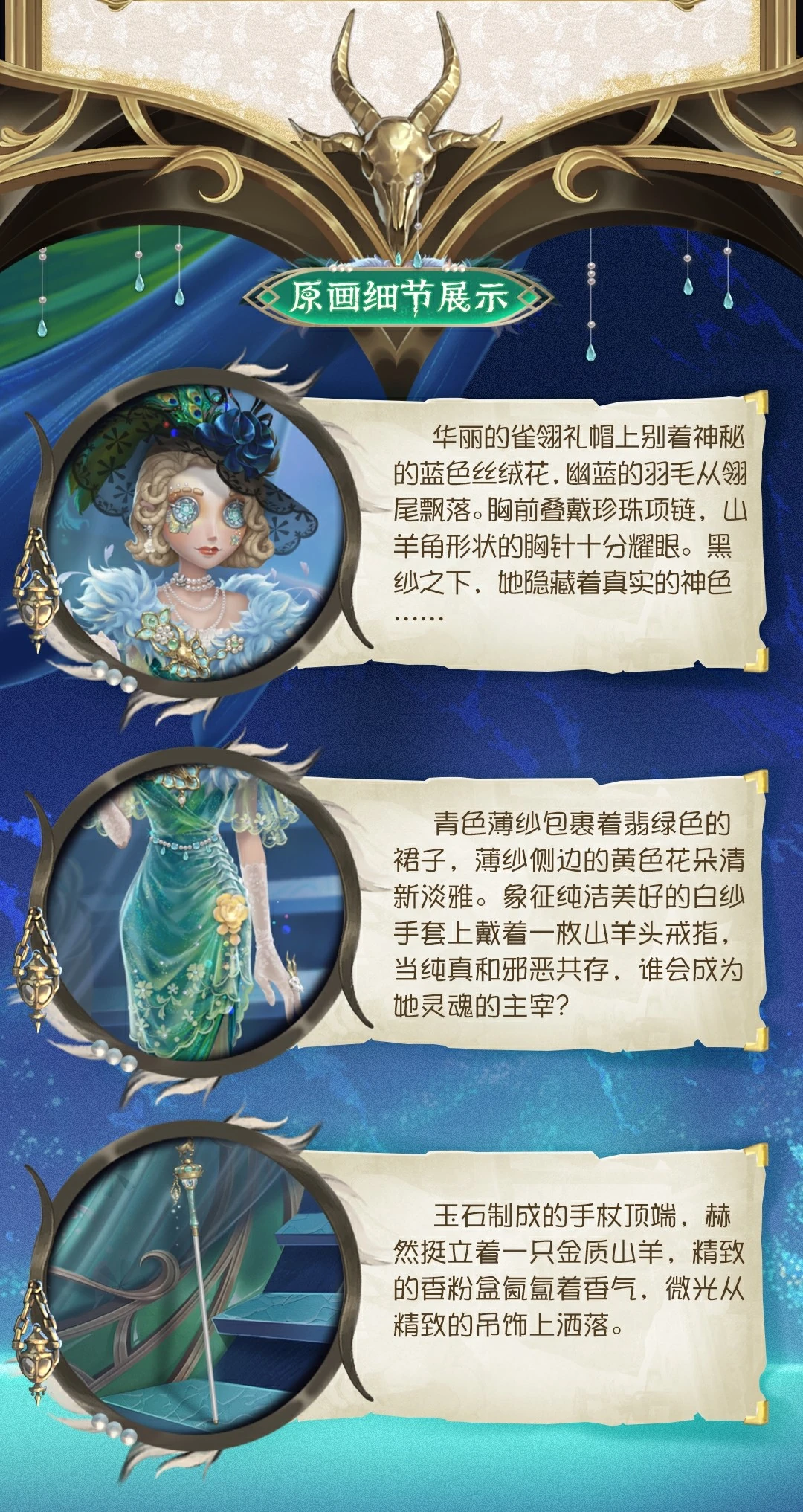 The emerald green skirt is wrapped in cyan tulle, and the yellow flowers on the side of the tulle are fresh and elegant. A goat head ring is worn on the white gauze gloves that symbolize purity and beauty. When innocence and evil coexist, who will become the master of her soul?