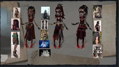 The Enchantress's gold outfit, the overall design direction is a gothic dark fairy tale style, and the temperament must have the feeling of a female warrior. There will be lion hair, scarecrow's head, iron, red crystal and other elements on the body.